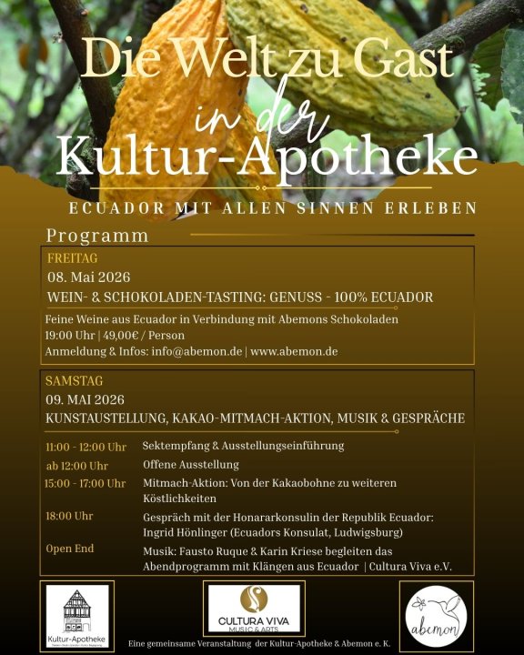 Kommt vorbei, entdeckt Ecuador in seiner geschmacklichen, künstlichen und kulturellen Vielfalt und erlebt zwei besondere Tage in der Kulturapotheke. Wir freuen uns auf Euch!